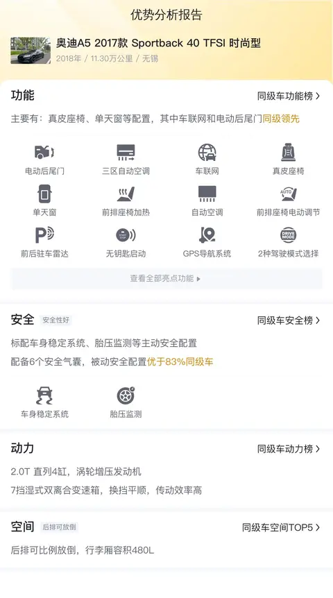 总之,今天我们要介绍的这辆奥迪A5 2017款 Sportback 40 TFSI 时尚型,作为一辆二手车,它在车况、里程和过户次数等方面都表现出了较高的性价比。如果你正在寻找一辆品质可靠、性能稳定的二手车,那么这辆售价为11.68万元的奥迪A5无疑是一个值得考虑的选择。当然,在购买前,请务必进行详细的检查和评估,以确保车辆符合你的需求和期望。祝你在二手车市场中能找到心仪的座驾,享受驾驶的乐趣!
