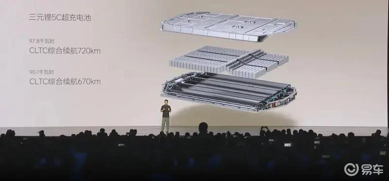 动力方面,新车全系标配双电机智能四驱系统,首次搭载自研碳化硅驱动电机,前后电机最大功率分别为150千瓦以及250千瓦,综合功率可达400千瓦。电池方面,新车全系标配5C三元锂电池,提供90.1kWh和97.8kWh两种容量的电池组,续航里程为670km和720km。