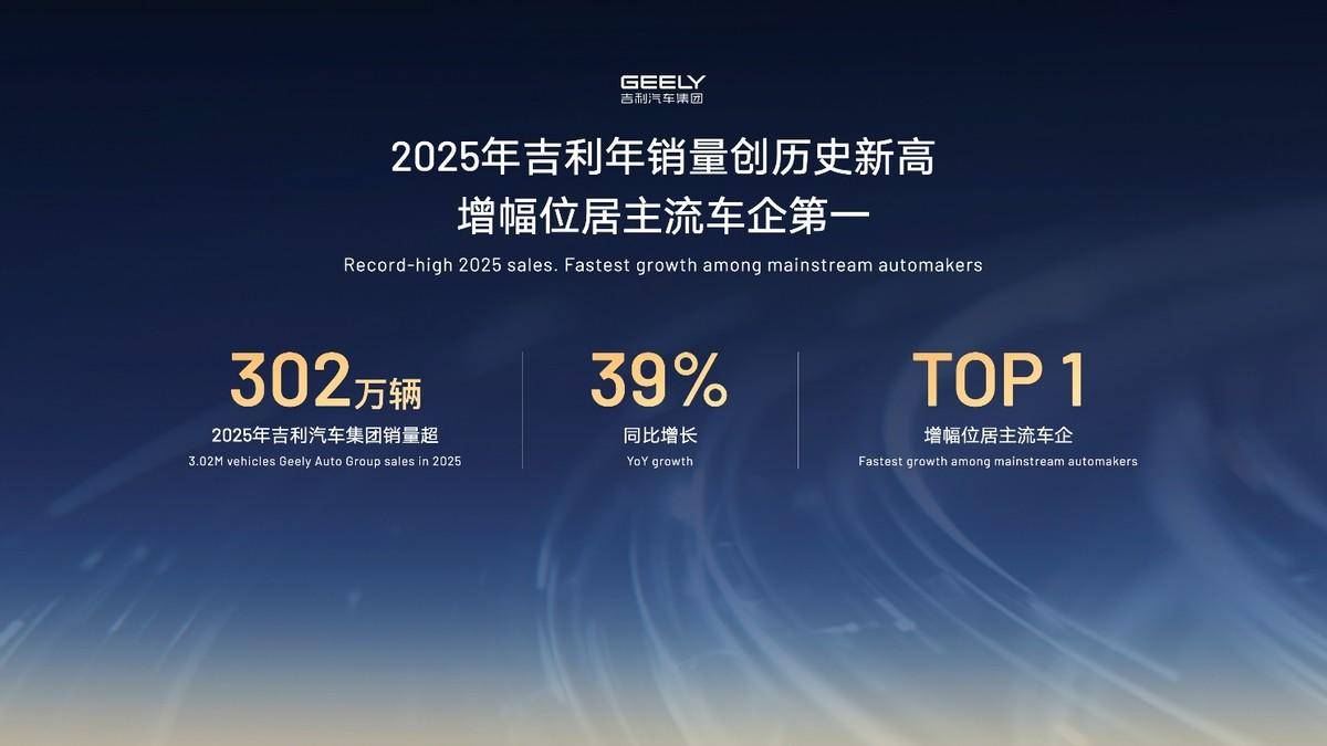2025年,吉利汽车集团累计销量302万辆,创下历史新高,同比增长39%,增幅位居主流车企第一位。2026年,吉利汽车集团将全年销量目标定为345万辆,其中出口销量目标64万辆。基于此,吉利将践行“区域深耕”+“全球协同”的全球化战略,并将在全球打造3个15万级、2个10万级区域市场,持续向全球市场输出高价值智能精品车,稳步推进高质量出海。