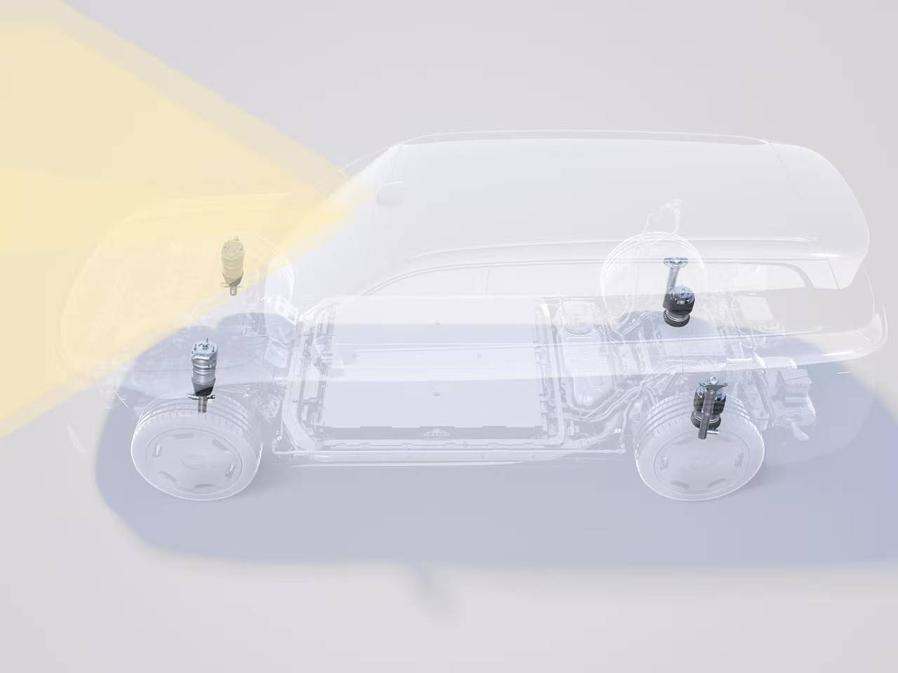 那它做的第一件事就是调整空悬的高度,因为在发生爆胎的一瞬间,由于轮胎的压力突然消失,所以车辆重心会向爆胎一侧偏移,那这时候LMC2.0底盘运动融合控制就会告诉高速爆胎稳定系统,有车轮爆胎了,然后爆胎侧的空悬也会快速升高,来帮助车辆恢复重心,从而减轻爆胎带来的影响。