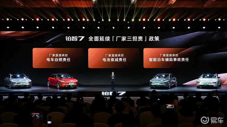 不止于权益,铂智7更以两大承诺为用户全程兜底:“三电系统终身质保”,彻底打消用户长期用车焦虑;“厂家三担责”——电车自燃、智能泊车事故、电池衰减,均由厂家承担责任。