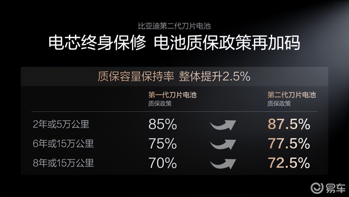 值得一提的是,比亚迪同步升级了质保政策,电池容量保持率整体提升2.5%,电芯继续提供"终身保修"服务。