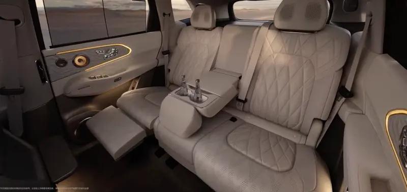 极氪8X的后排空间极为宽敞,并且顶部还搭载了大尺寸娱乐屏,此外还配备了Naim音响系统。尺寸方面,新车长宽高分别为5100/1998/1780mm,轴距为3069mm。