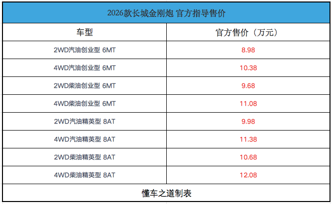 2026款金刚炮整车采用高强度笼型车身结构,大截面加强型车架设计,车架高强钢占比超98%,截面宽度同级最大,承载能力更强,安全性更高;整车经过1728小时强化腐蚀试验、1000小时盐雾实验,远超国家标准,可做到5年不锈蚀、10年不锈穿;长城皮卡全国2000余个销售服务网点。