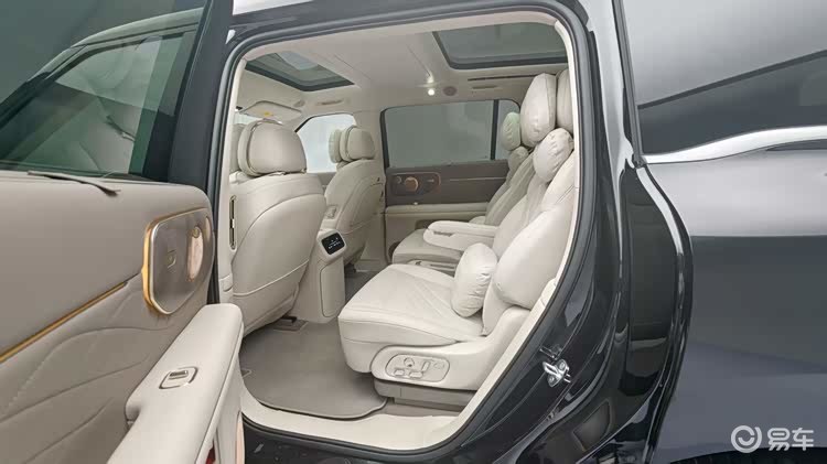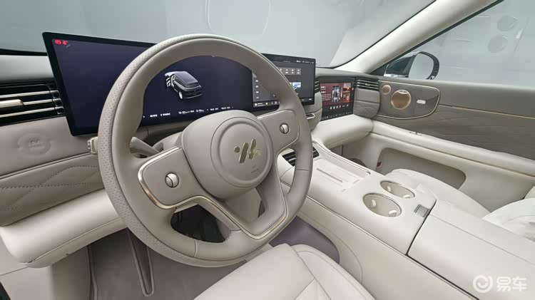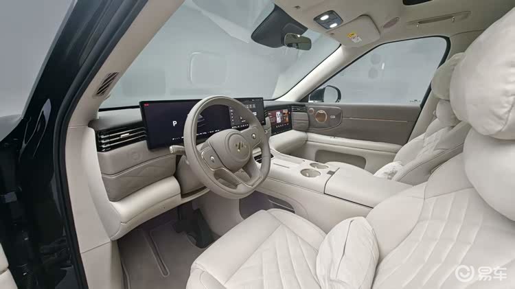 内饰方面,它的设计倒是相对来说比较低调一些了,你可以看出来很明显的品牌家族化风格,再加上它又是一款新能源车型,所以车内的风格其实相对来说还是比较简单的,一块双联屏,配合着一块副驾驶娱乐屏,这就是中控台的全部。中控台搭载27.1英寸5K臻彩驾舱屏,副驾前方还搭载了一块15.6英寸3K副驾娱乐屏,科技氛围直接拉满。此外,新车中国市场首搭百年豪华音响品牌B&O,全球首搭4D机械按摩座椅。