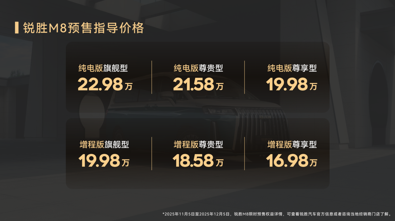 当前,大型MPV市场存在产品空白,消费者在“商务接待、家用休旅”等多元场景中,长期面临选择有限、功能割裂的困境。锐胜M8的推出,以“越级空间、越级补能、越级续航、越级舒享”四大核心优势,为用户提供“宜商、宜家、宜旅”的全场景出行解决方案。越级空间、多种动力、1420kmCLTC综合续航、智驾辅助与丰富配置,让出行兼具舒适与安全,带来30万级的舒享体验。