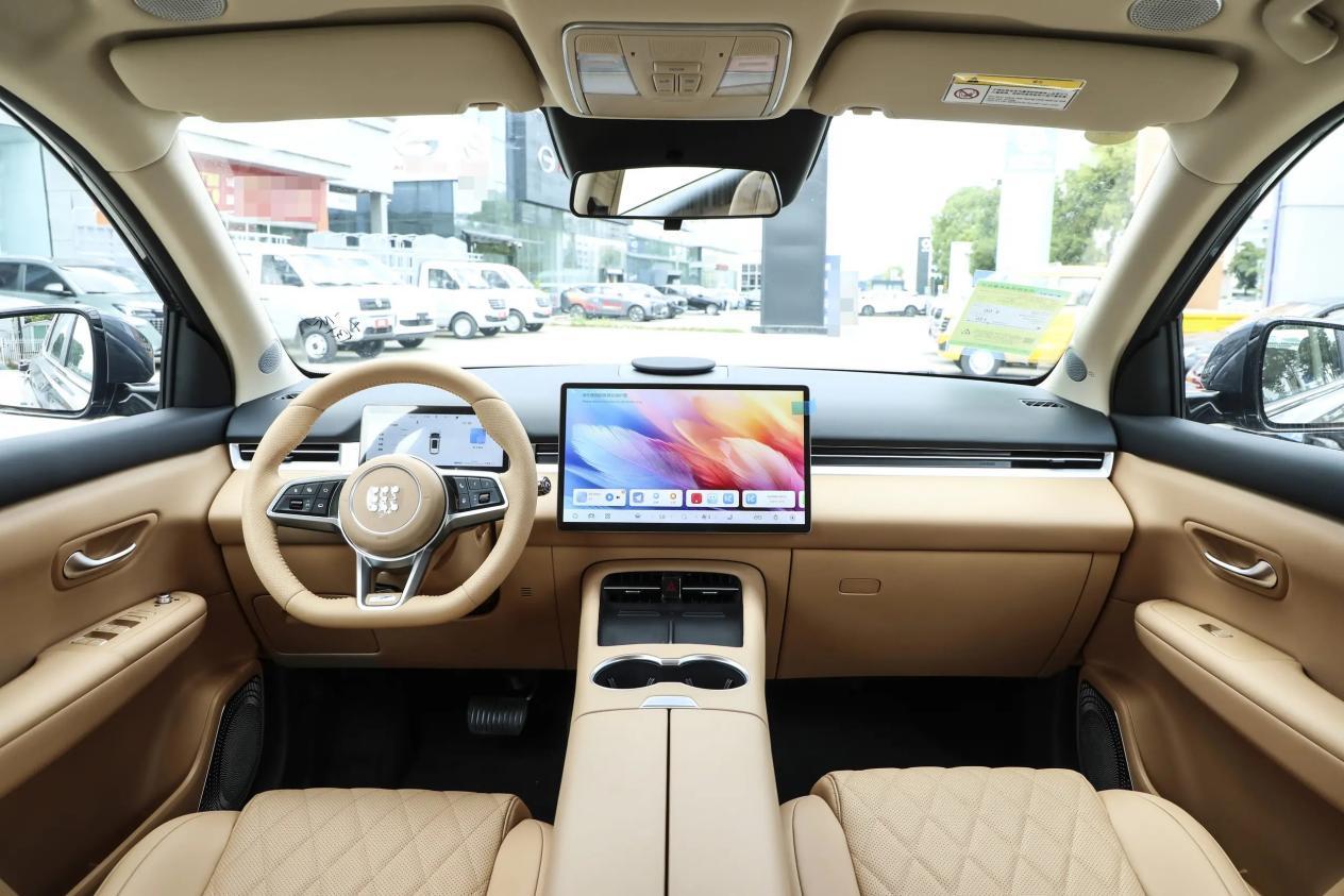 内饰设计简约,配备8.8英寸全液晶仪表盘和15.6英寸悬浮式中控屏、三辐式多功能方向盘、电动天窗、电子怀挡等配置。